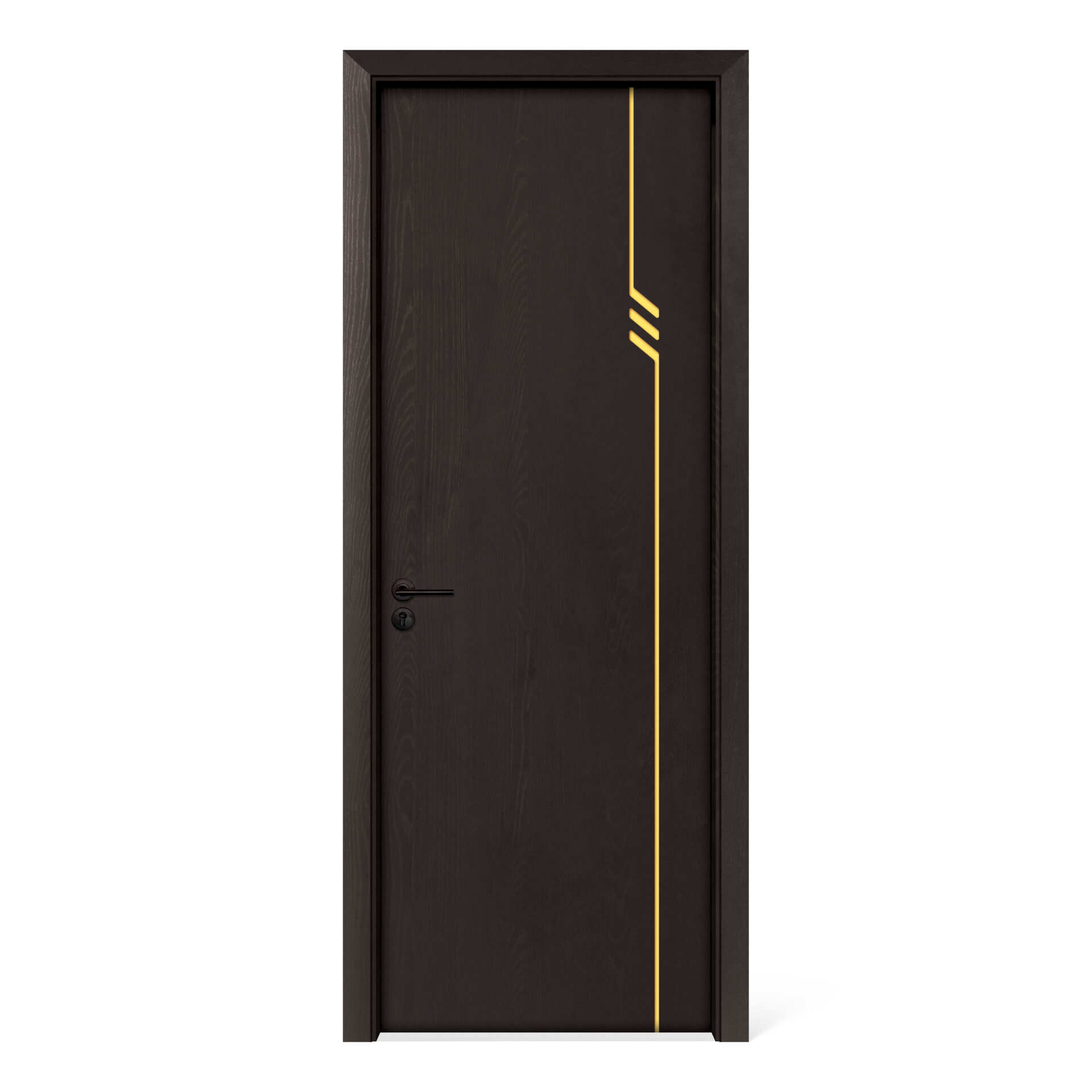 Điểm nhấn của cửa M50 nằm ở đường chỉ silicone vàng ánh kim chạy dọc lệch bên phải, tạo nên sự phá cách tinh tế trên bề mặt vân gỗ đen huyền bí. Sự kết hợp hài hòa giữa hai gam màu này mang đến vẻ đẹp sang trọng, hiện đại, phù hợp với nhiều phong cách kiến trúc.